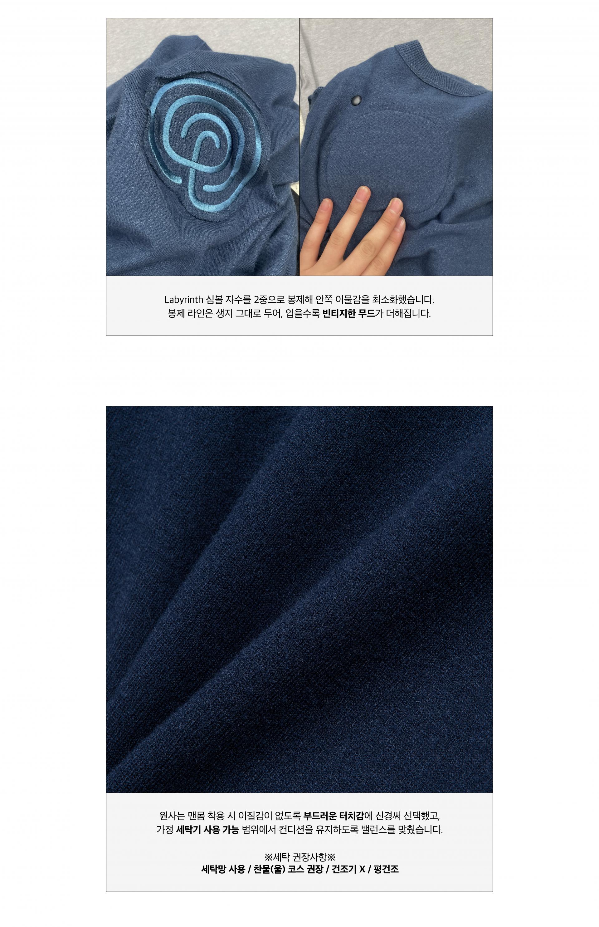 원사는 맨몸 착용 시 이질감이 없도록 신경 써 선택했고, 가정용 세탁 가능 범위에서 컨디션을 유지하도록 밸런스를 맞췄습니다. 가슴 라비린스 자수의 경우 이중 봉제로 안쪽 이물감을 최소화했습니다. 이중 봉제 라인은 생지 그대로 두어, 입을수록 빈티지한 무드가 더해집니다.