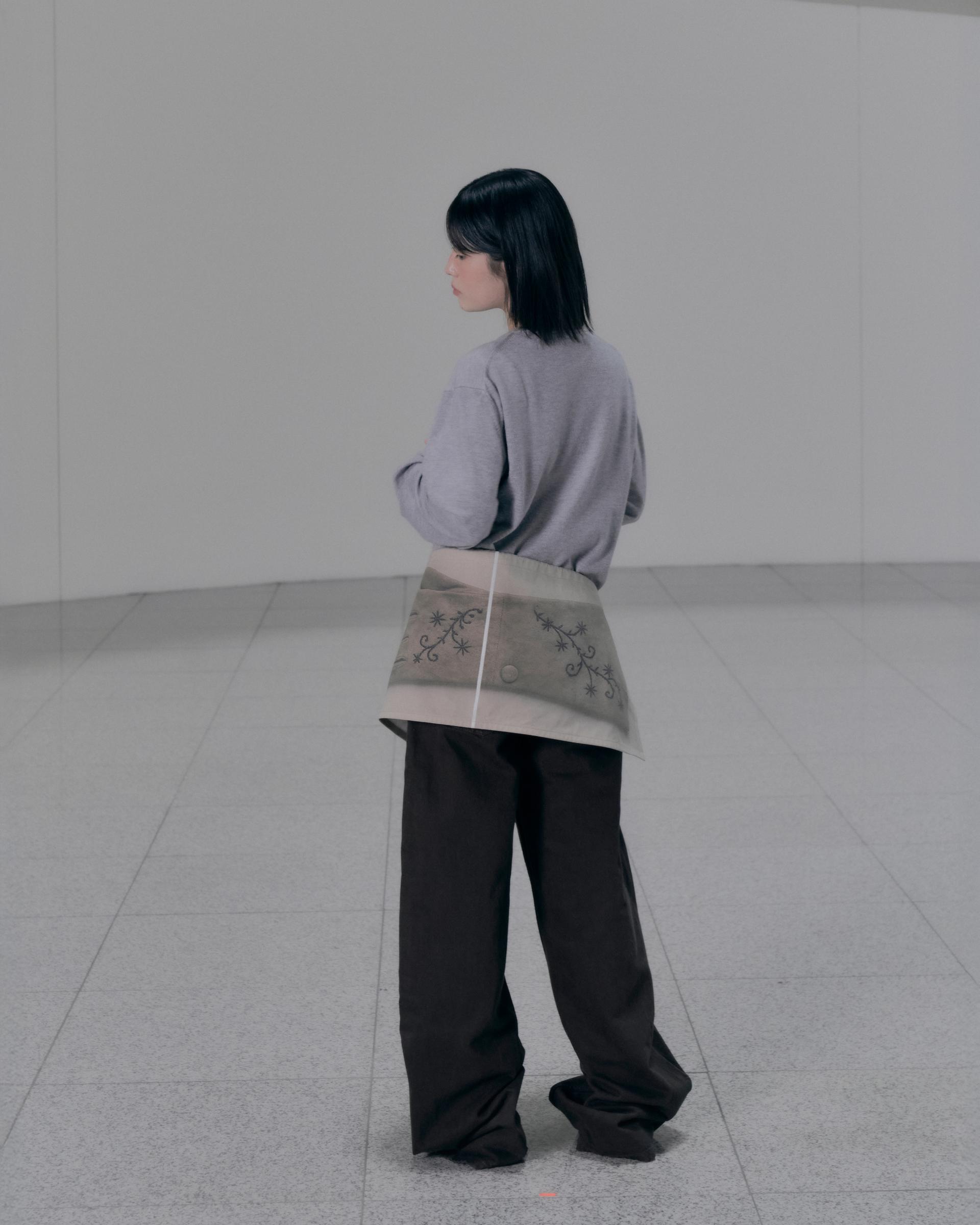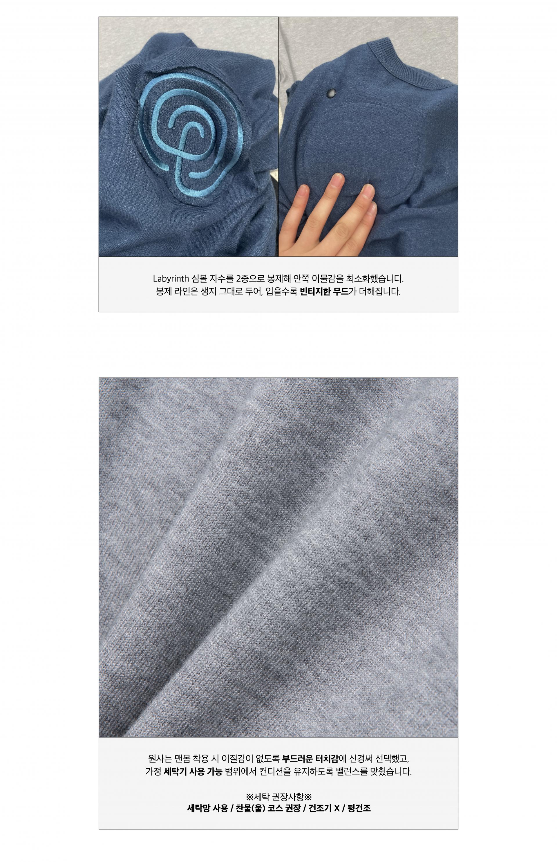 원사는 맨몸 착용 시 이질감이 없도록 신경 써 선택했고, 가정용 세탁 가능 범위에서 컨디션을 유지하도록 밸런스를 맞췄습니다. 가슴 라비린스 자수의 경우 이중 봉제로 안쪽 이물감을 최소화했습니다. 이중 봉제 라인은 생지 그대로 두어, 입을수록 빈티지한 무드가 더해집니다.